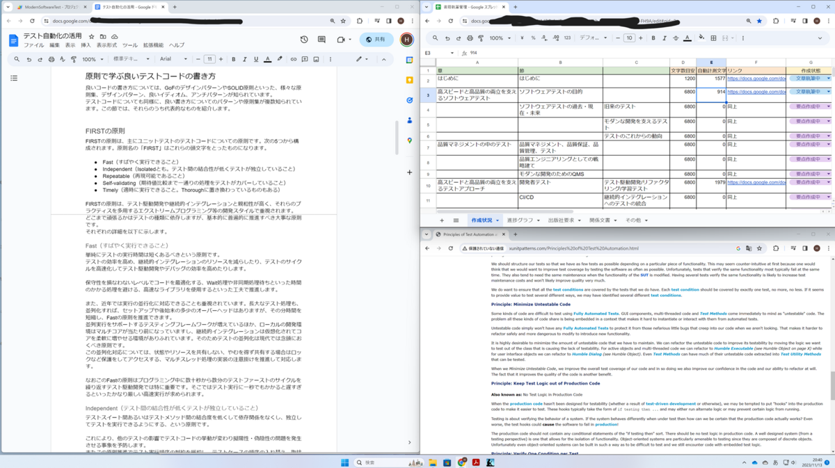 執筆環境では、次のように画面を4分割して執筆しています。